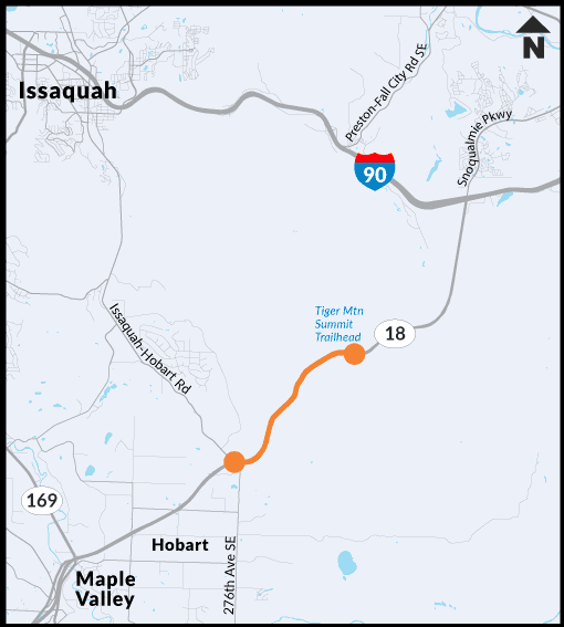 Heavy rain across western Washington in February saw multiple landslides in the Snoqualmie Valley, including one on the shoulder of SR 18 – about 1.5 miles west of the Tiger Summit Trailhead.