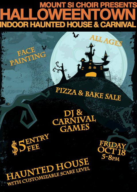 Tomorrow – Friday, October 18th from 5 – 8PM, choir members are hosting Halloween Town, an indoor haunted house and carnival, at Mount Si High School, 8651 Meadowbrook Way SE.