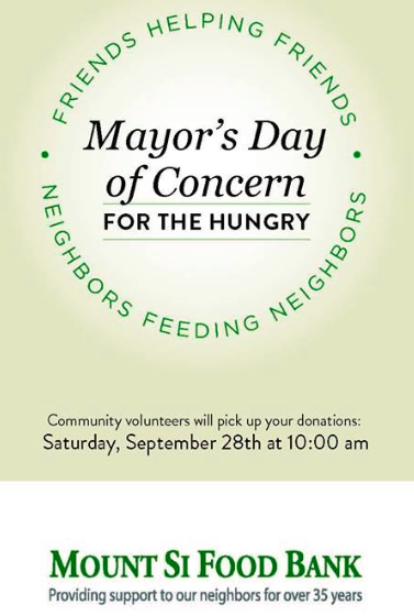 Bend, Snoqualmie and Fall City neighborhoods this week and will then be collecting needed items for the Mt. Si Food Bank starting at 10AM, Saturday September 28, 2013.