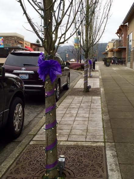 So if you’re walking or driving around and notice purple ribbons and painted storefronts, you’ll know once again it’s Snoqualmie Valley community members “purpling up” for this year’s cancer fundraising event.
