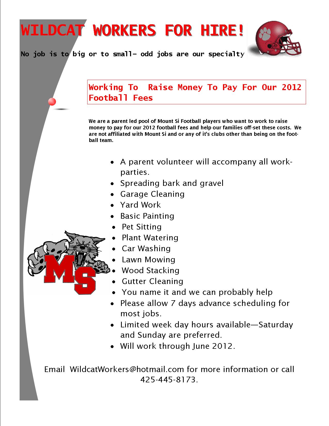 “Wildcat Workers for Hire! We are a parent led pool of Mount Si Football players who want to work to raise money to pay for our 2012 football fees and help our families’ off-set these costs. We can do yard work, spread bark/gravel, lawn mowing, wood stacking, pet sitting, car washing, basic painting, gutter cleaning… you name it and we can probably do it. A parent volunteer will accompany all work parties. They are willing to work hard to pay for the cost of football. More info email WildcatWorkers@hotmail.com or call 425-445-8173.“