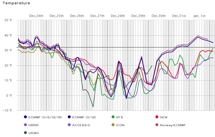 This chart shows the highs and lows out to the 1st of the year. As you can see, we will be below freezing for multiple days.