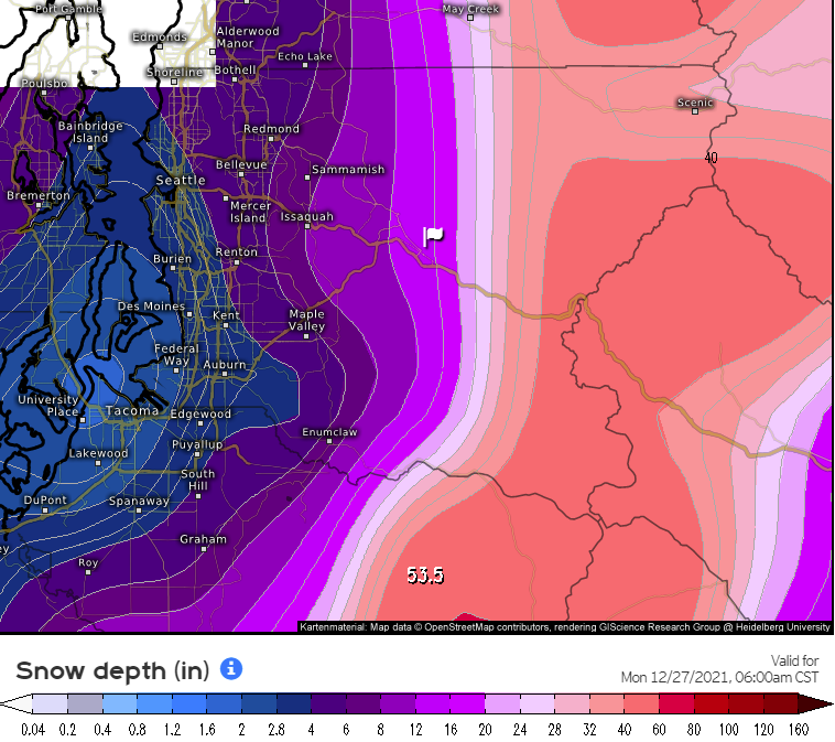 As for the total accumulation of snowfall, here are 2 models ending at 4 am our time on Monday. As you can see they both still don’t agree on the totals. The white flag on the maps is for North Bend.