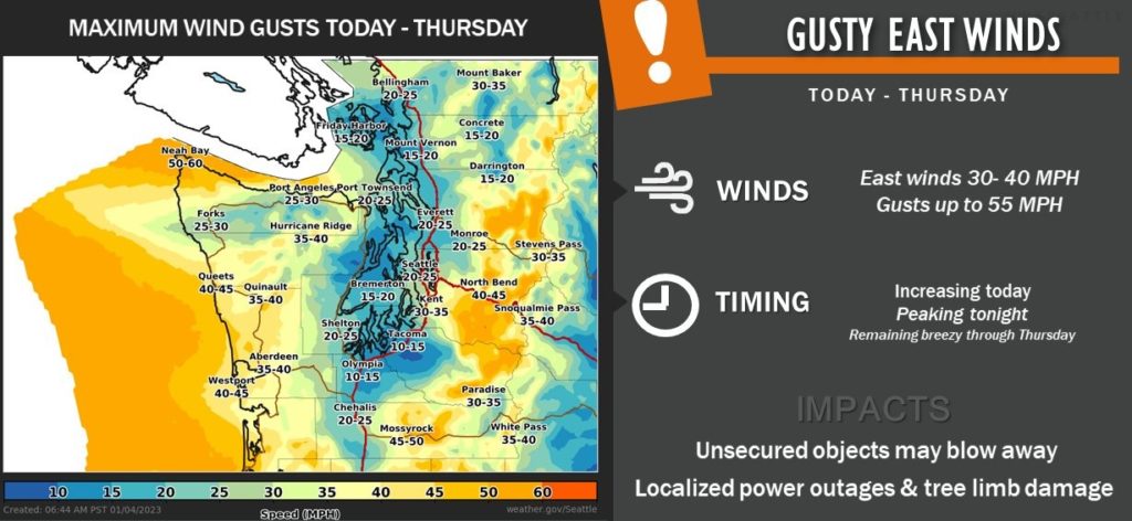 The National Weather Service (NWS) has issued a wind advisory that may impact parts of King County, including North Bend and Snoqualmie, from 4 p.m. on Wednesday, January 4, through 4 a.m. on Thursday, January 5.
