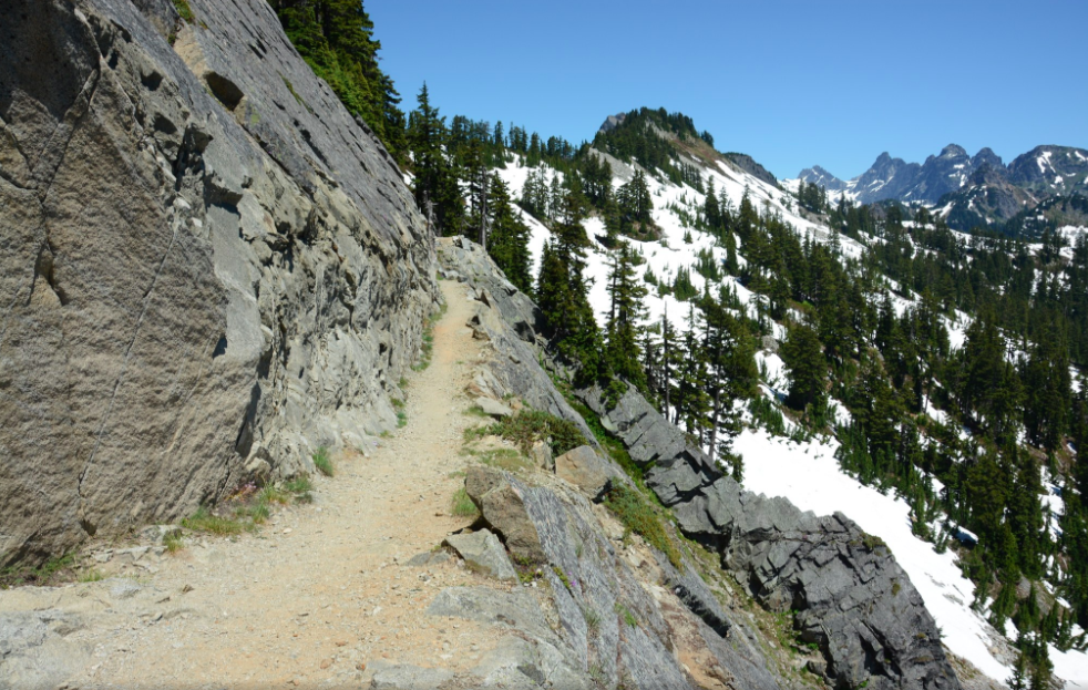 The Kendall Katwalk Trail is about 12 miles roundtrip with beautiful vistas and includes a narrow pathway on a the side of a sloped rock face.