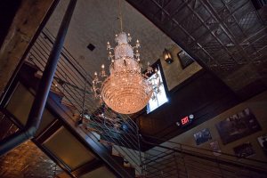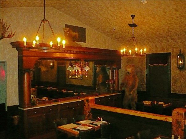 The interior of the Woodman Lodge is a step back in time. No detail was missed. The bar, modeled after a history book 1903 saloon bar photo, was constructed in northern California. 35lb solid brass eagle talons support its zinc top. Even the beer taps were hand-crafted in Europe to match the era design. The antique “Prosperity” stove took two years to find. Eagles flank its sides – symbols of the Woodsmen of America. The coal stove was converted to natural gas; turns out the conversion cost more than the stove itself. The grand staircase’s hand-crafted iron work mirrors tree branches. Above the staircase hangs a beautiful, gold-plated, leaded crystal chandelier. At the foot of the staircase sits a 1911 player-piano, which is now musician-ready or run by an iPod if needed. Old growth, Canadian-harvested douglas fir timber flank the table tops and the floors. There are even real gas lamps lining the walls.