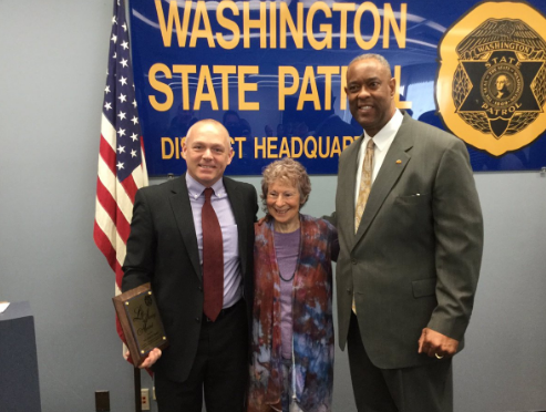 Sergeant JD Smith of the Seattle Police Department and Mr. Mike Brennan were honored for their heroics on July 18, 2016 when a collision occurred eastbound on I-90 at the SR 18 interchange – one that resulted in a vehicle immediately bursting into flames.