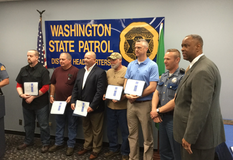 A Certificate of Commendation was also presented to Detective Rich Newell (Bellevue PD), Albert Williams, Daniel Kettner, Nathan Fleming and James Hoole (Retired San Diego PD) for providing assistance to WSP Trooper Brad Olsen during an altercation that happened near Truck Town in mid April.