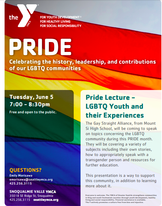 On Tuesday, June 5th from 7:00 – 8:30pm, in honor of PRIDE month, the Snoqualmie Valley YMCA will be hosting an event with the Gay Straight Alliance from Mount Si High School.